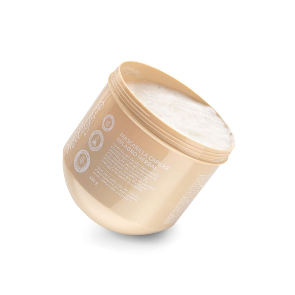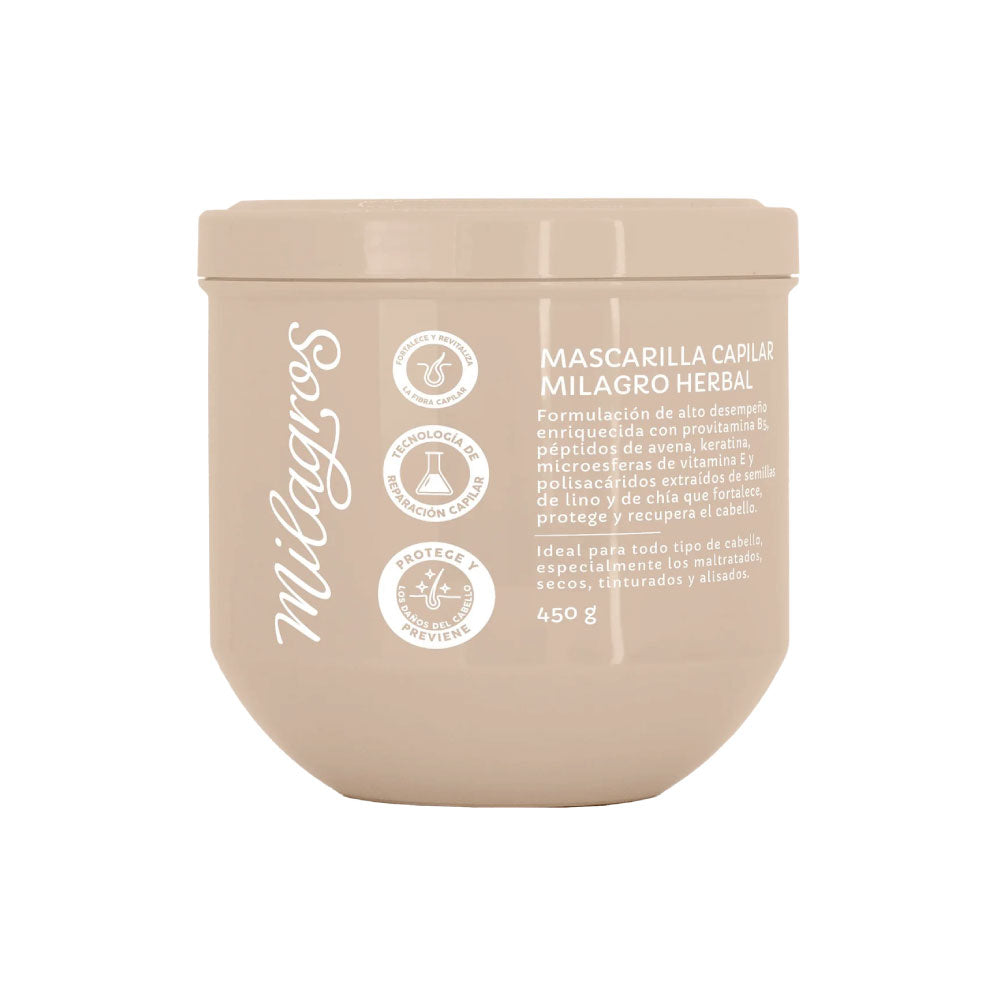 La mascarilla capilar de Milagros es una formulación de alto desempeño enriquecida con provitamina B5, péptidos de avena, keratina, microesferas de vitamina E y polisacáridos extraídos de semillas de lino y de chía que sirve para fortalecer, proteger y recuperar el cabello.